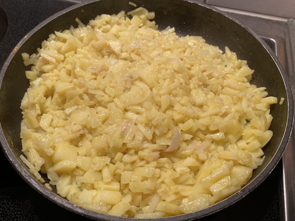 - In a deep frying pan set heat to medium, fry onion and potatoes until potatoes are cooked and soft